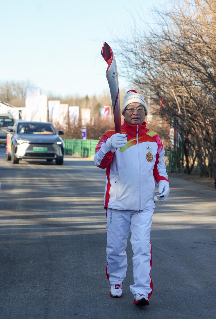 2月2日,北京冬奧會火炬在北京奧林匹克森林公園傳遞,火炬手葉培建在火炬?zhèn)鬟f中。新華社記者 賈浩成 攝