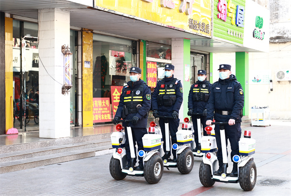圖為濱江路警務(wù)站巡邏隊(duì)在步行街巡邏。