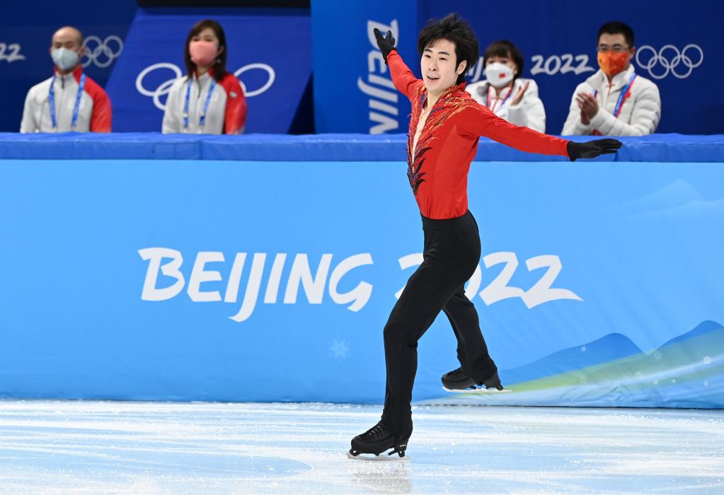2月6日,中國選手金博洋在北京2022年冬奧會花樣滑冰團體賽男子單人滑自由滑比賽中。新華社記者馬寧攝