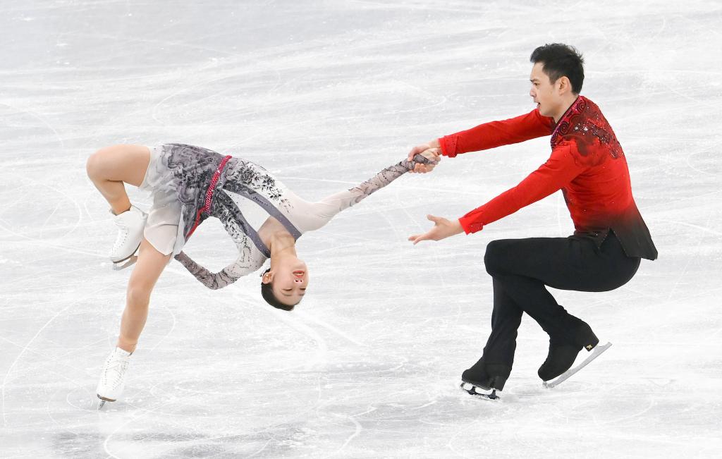 2月7日,中國選手彭程(左)、金楊在北京2022年冬奧會花樣滑冰團(tuán)體賽雙人滑自由滑比賽中。新華社記者劉瀟攝