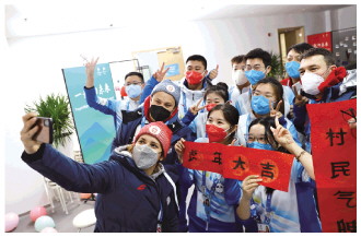 春節(jié)期間,北京冬奧會延慶賽區(qū)冬奧村里張燈結(jié)彩,志愿者和各代表團成員相聚一堂,慶祝歡樂祥和的春節(jié)。圖為塞爾維亞代表團成員和志愿者在延慶冬奧村合影留念。新華社發(fā) 肖紹雯 攝