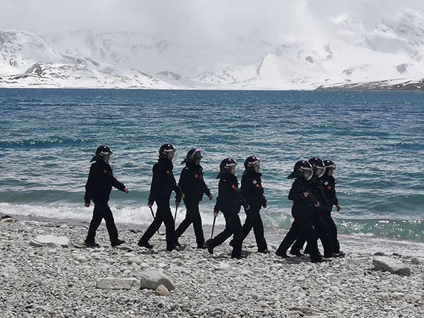 在20公分深的積雪地里,呂加駿深一腳淺一腳地前行,“小心腳下,這雪山下面有暗冰,別滑倒了”。呂加駿叮囑著身后的尼瑪頓珠,巡邏路是繞山體修建的上坡路,勉強(qiáng)能夠通行一輛車,靠山體的一側(cè)時(shí)不時(shí)滾落下零零散散的石頭,而另一邊就是懸崖峭壁,海拔近5000米的冰雪巡邏路上,不斷消耗著大家的體力,雙腳像被系上了幾十斤的重的大鐵鏈。寒冷而又稀薄的空氣吸入后,不斷刺激著肺部,呂加駿的胸口隱隱作痛,臉頰被凍得通紅,防寒帽的外檐早已結(jié)上了一層厚厚的沙冰。大家的喘氣聲越來(lái)越急促,踩在碎石雪上的吱呀聲越來(lái)越緩慢。