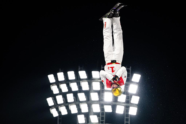 2月10日,中國隊選手賈宗洋在北京冬奧會自由式滑雪空中技巧混合團體決賽比賽中。新華社記者肖藝九攝