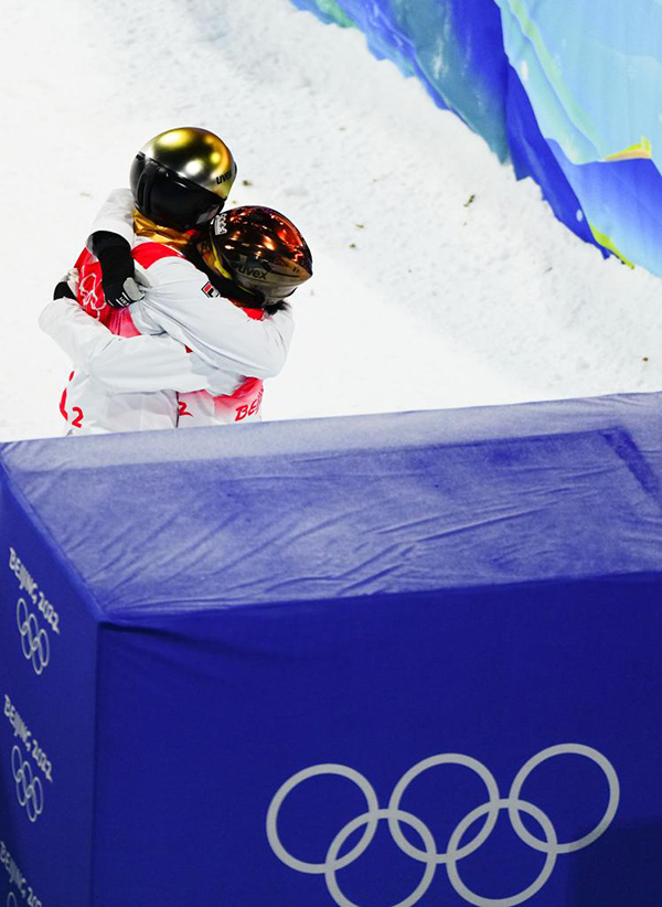 2月10日,中國隊選手徐夢桃(右)和賈宗洋在北京2022年冬奧會自由式滑雪空中技巧混合團體決賽比賽后擁抱。新華社記者許暢攝