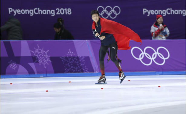 2018年2月19日,中國(guó)選手高亭宇在平昌冬奧會(huì)速度滑冰男子500米比賽后慶祝,高亭宇以34秒65的成績(jī)獲得季軍。新華社記者韓巖攝