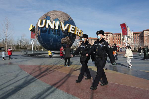 晴空如洗,游人如織。春節(jié)前夕,《法治日?qǐng)?bào)》記者來(lái)到北京環(huán)球度假區(qū),跟隨北京市公安局通州分局文景派出所民警,體驗(yàn)他們“日行三萬(wàn)步”的工作日常。