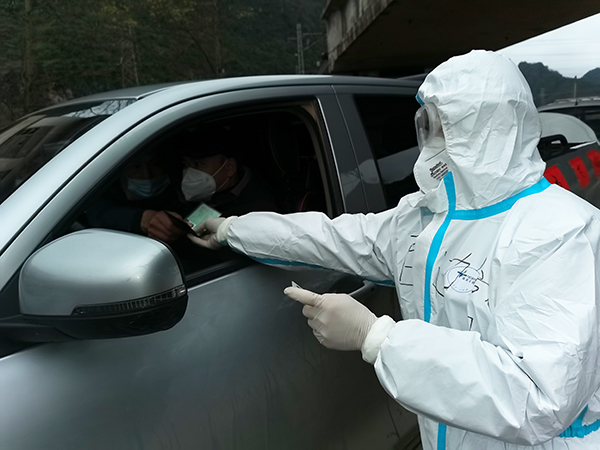 看到一輛面包車從遠(yuǎn)處駛來(lái),楊京龍舉起手中的停車牌,示意司機(jī)停車接受檢查?!巴?,你的通行證已過(guò)期,不能從這里通過(guò)。”看到司機(jī)的通行證已過(guò)期,楊京龍耐心講解了疫情防控期間的交通管制政策,勸返司機(jī)。
