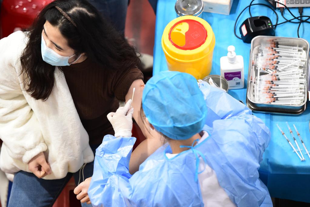2022年1月6日,在安徽農(nóng)業(yè)大學新冠疫苗接種點,醫(yī)護人員為師生接種新冠疫苗加強針。(新華社記者黃博涵 攝)