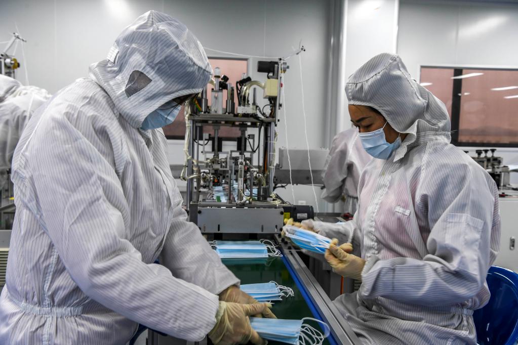 2022年2月18日,在廣西百色市一家口罩生產(chǎn)企業(yè)內(nèi),工作人員在生產(chǎn)線上忙碌。自2月15日零時起,廣西百色市部分縣(市、區(qū))解除“不進不出”管控措施,當?shù)卣行驈凸彤a(chǎn)。(新華社記者曹祎銘 攝)