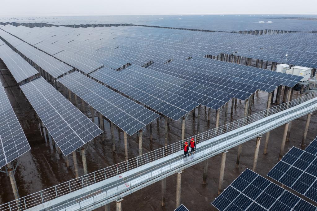 圖為2021年12月29日拍攝的浙江省寧波市象山縣長(zhǎng)大涂灘涂光伏項(xiàng)目(無(wú)人機(jī)照片)。(新華社記者徐昱攝)