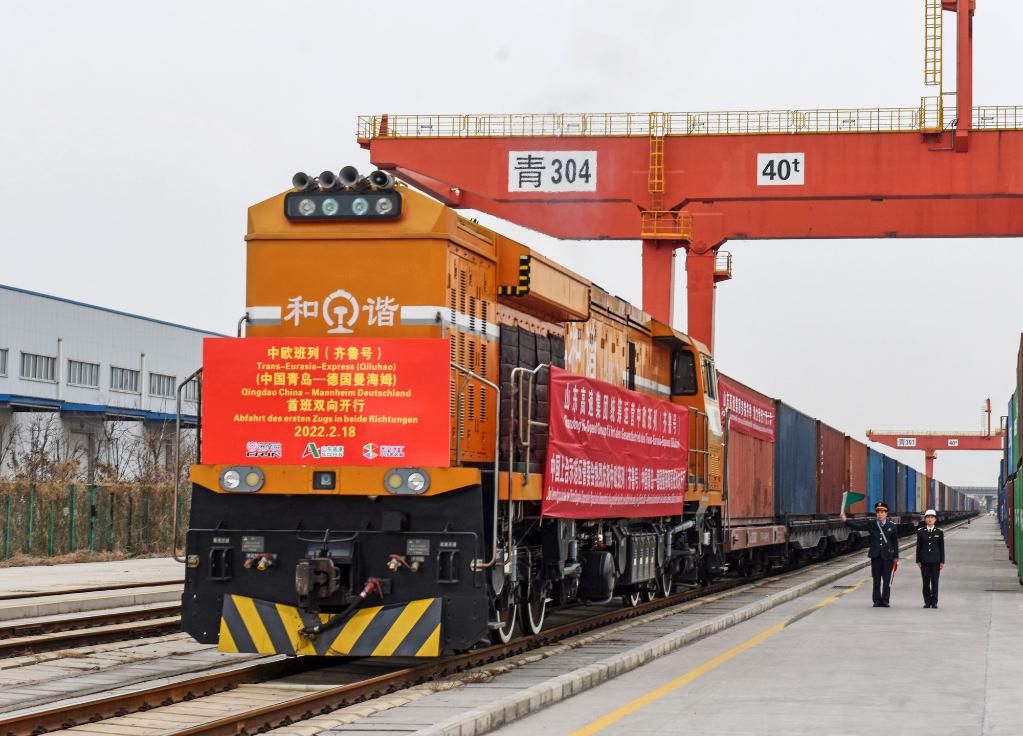 2月18日,中歐班列(齊魯號(hào))中國(guó)青島—德國(guó)曼海姆雙向?qū)﹂_(kāi)首班列車從上合示范區(qū)青島多式聯(lián)運(yùn)中心出發(fā)。(新華社發(fā),王昭脈攝)