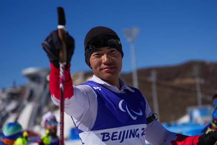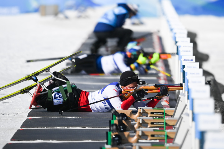 3月5日,中國(guó)選手劉子旭奪得北京冬殘奧會(huì)殘奧冬季兩項(xiàng)男子短距離(坐姿)比賽冠軍。新華社記者彭子洋攝
