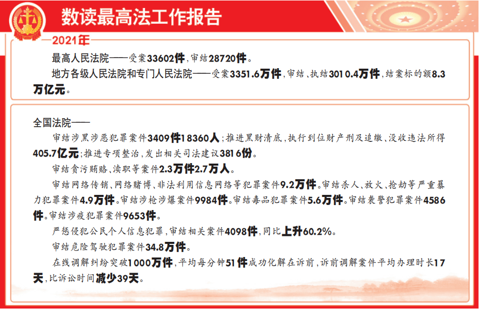 過去一年,司法前行的印記更加清晰,法治中國的腳步更加堅毅,報告中的一個個案例,傳遞了鮮明的價值導向,讓法律條文走進千家萬戶。報告中的一串串數(shù)據(jù),勾勒出平安中國、法治中國建設新成效:2021年,最高人民法院受理案件33602件,審結28720件,制定司法解釋24件,發(fā)布指導性案例31個;地方各級人民法院和專門人民法院受理案件3351.6萬件,審結、執(zhí)結3010.4萬件,結案標的額8.3萬億元,助推實現(xiàn)國家安全、社會安定、人民安寧。