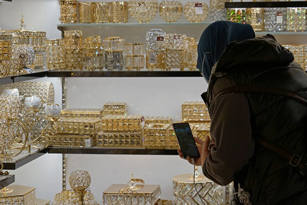 義烏國際商貿城一家水晶商鋪內,業(yè)務員小丁正在貨架前進行遠程視頻連線,手機的另一頭連著巴勒斯坦。受疫情影響,海外客商來華不便,遠程直播成為其采購之“眼睛”?!翱蛻魮倪@個燈臺尺寸比較大,運費會不會比較貴?”業(yè)務員小丁問?!皼]問題,主體和燈座可以拆卸,包裝不占空間?!鄙啼佖撠熑藙s斌立即回復。