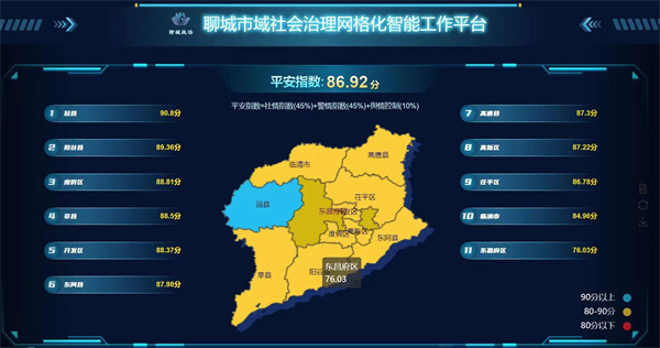 試點(diǎn)工作中,聊城市運(yùn)用市域社會治理智能化平臺助力深化平安建設(shè),在平臺定期生成全市“平安指數(shù)”,涵蓋各縣區(qū)社會治安、道路交通、安全生產(chǎn)等10項指標(biāo),引導(dǎo)精準(zhǔn)查找、整改短板問題。針對重大活動,發(fā)揮平臺研判決策、指揮調(diào)度功能,對問題及時發(fā)現(xiàn)處置,助力工作嚴(yán)格落實。