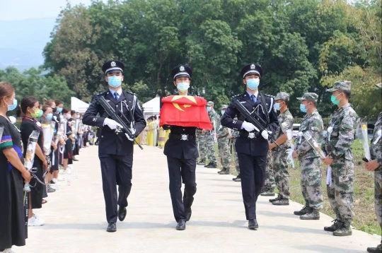 3月30日,蔡曉東烈士被安葬在云南省西雙版納景洪市勐龍烈士陵園,長眠在他用生命守護的邊境線旁。圖為安葬儀式現(xiàn)場。 云南出入境邊防檢查總站供圖