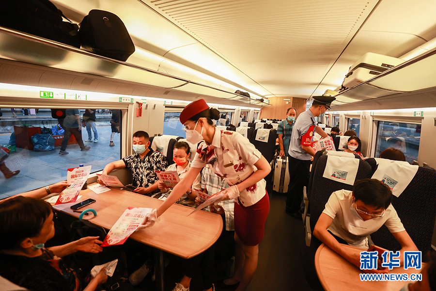 6月23日,民警和鐵路職工在列車上向旅客開(kāi)展禁毒宣傳。新華網(wǎng) 發(fā)