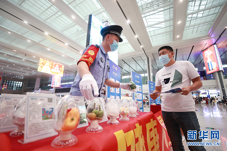 6月23日,民警在重慶北站候車廳向旅客展示毒品樣品。新華網(wǎng) 發(fā)