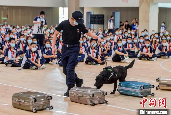 學(xué)生們與展示完搜索毒品技能的緝毒犬親密互動(dòng)。 劉新 攝