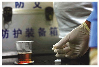4月20日,民警對犯罪嫌疑人尿液進行毒檢。
