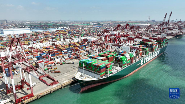 山東港口青島港前灣港區(qū),集裝箱貨輪在碼頭裝卸集裝箱(2022年6月15日攝,無人機(jī)照片)。新華社記者 李紫恒 攝