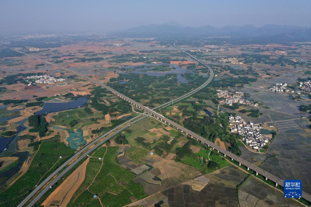 南廣高鐵和蒼碩高速在廣西賓陽(yáng)縣古辣鎮(zhèn)交匯(2022年4月4日攝,無人機(jī)照片)。新華社記者 黃孝邦 攝