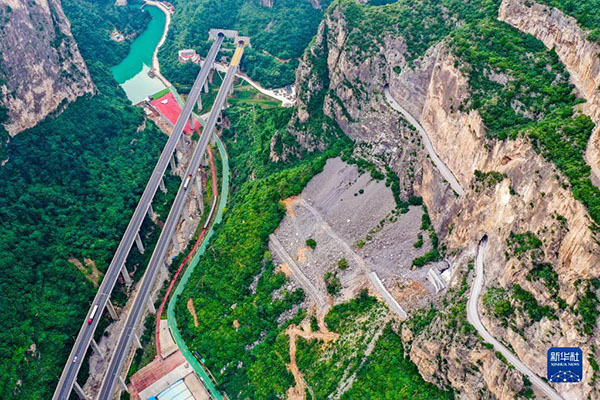 這是通過山西省長治市平順縣虹梯關(guān)鄉(xiāng)的高速公路(畫面左側(cè)),一旁是過去的“掛壁公路”(畫面右側(cè))(2022年7月5日攝,無人機(jī)照片)。新華社記者 曹陽 攝