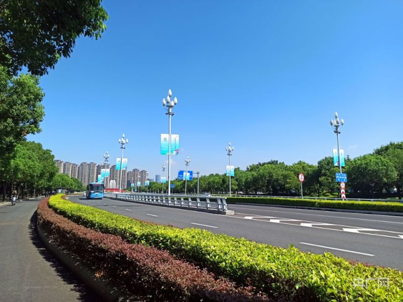 道路兩側(cè)以峰會為主題的道旗迎風而立(央廣網(wǎng)記者 羅曉英 攝)