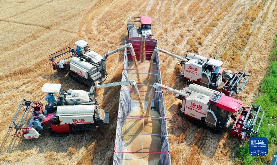 在合肥市蜀山區(qū)小廟鎮(zhèn)段沖村,收割機(jī)將小麥裝車(chē),確保顆粒歸倉(cāng)(2022年5月25日攝,無(wú)人機(jī)照片)。新華社發(fā)(陳三虎 攝)