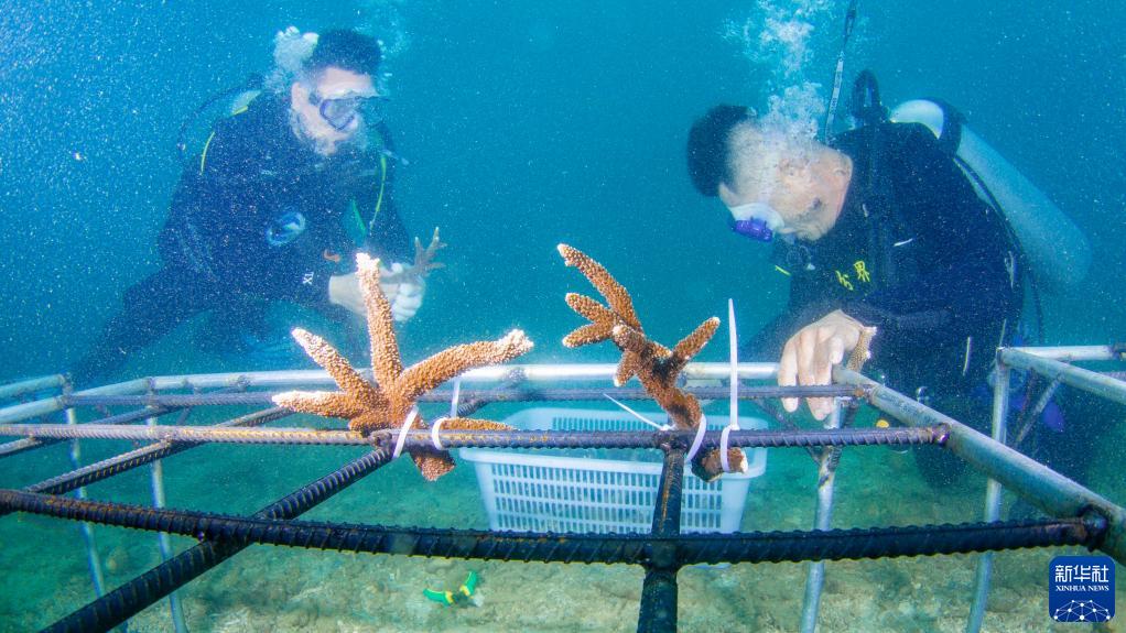 海南省海洋與漁業(yè)科學(xué)研究院的專(zhuān)家和分界洲島旅游區(qū)工作人員在海南省陵水黎族自治縣分界洲島附近海域移植珊瑚(2022年6月7日攝)。新華社記者 張麗蕓 攝