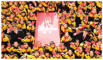 2014年11月,全國(guó)人大常委會(huì)作出決定將12月4日設(shè)立為國(guó)家憲法日。圖為2020年12月3日,山東省棗莊市市中區(qū)人民法院的法官與學(xué)生們一起迎接第7個(gè)“國(guó)家憲法日”的到來(lái)。 本報(bào)通訊員 吉喆 攝