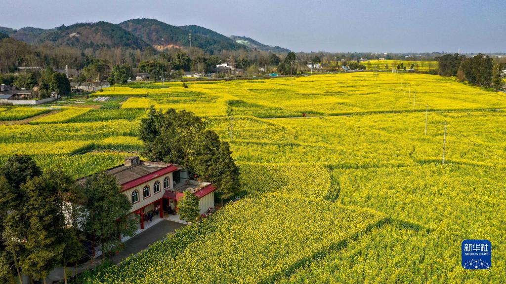 在四川成都崇州市拍攝的油菜花田(2020年2月25日攝,無(wú)人機(jī)照片)。新華社記者 王曦 攝