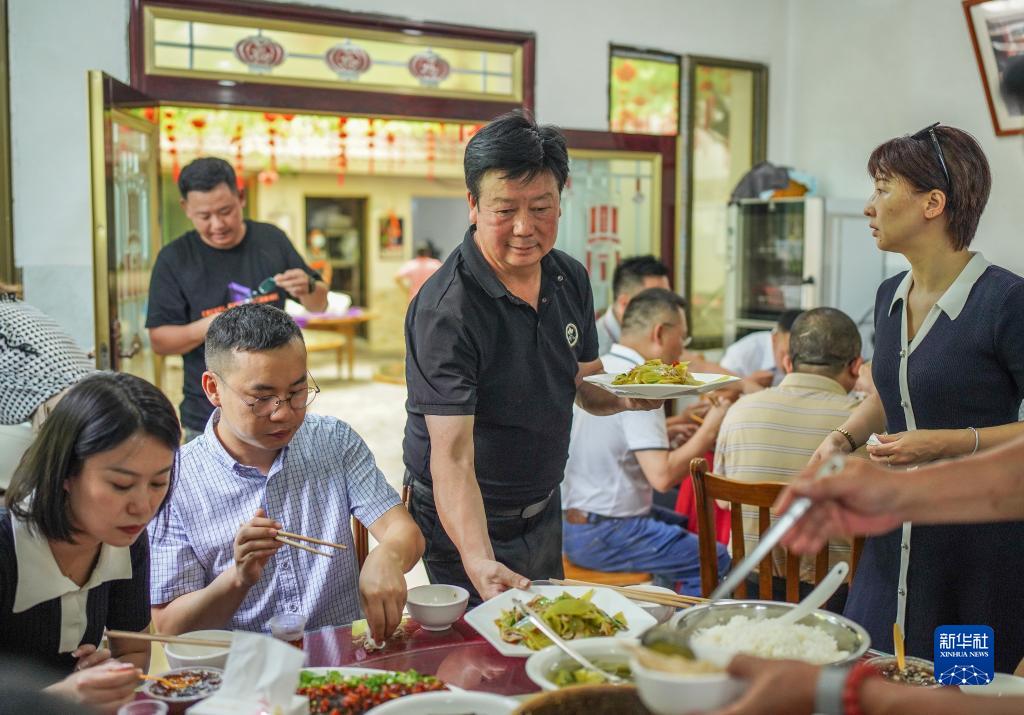 貴州省遵義市播州區(qū)楓香鎮(zhèn)花茂村村民王治強(qiáng)為到農(nóng)家樂(lè)就餐的游客上菜(2022年6月28日攝)。新華社記者 陶亮 攝