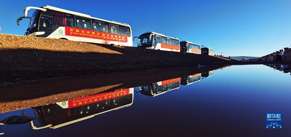 在西藏那曲市雙湖縣多瑪鄉(xiāng)拍攝的整裝待發(fā)的車隊,客車載著牧民前往位于山南市貢嘎縣的森布日安置點(diǎn)(2022年7月19日攝)。新華社記者 沈虹冰 攝