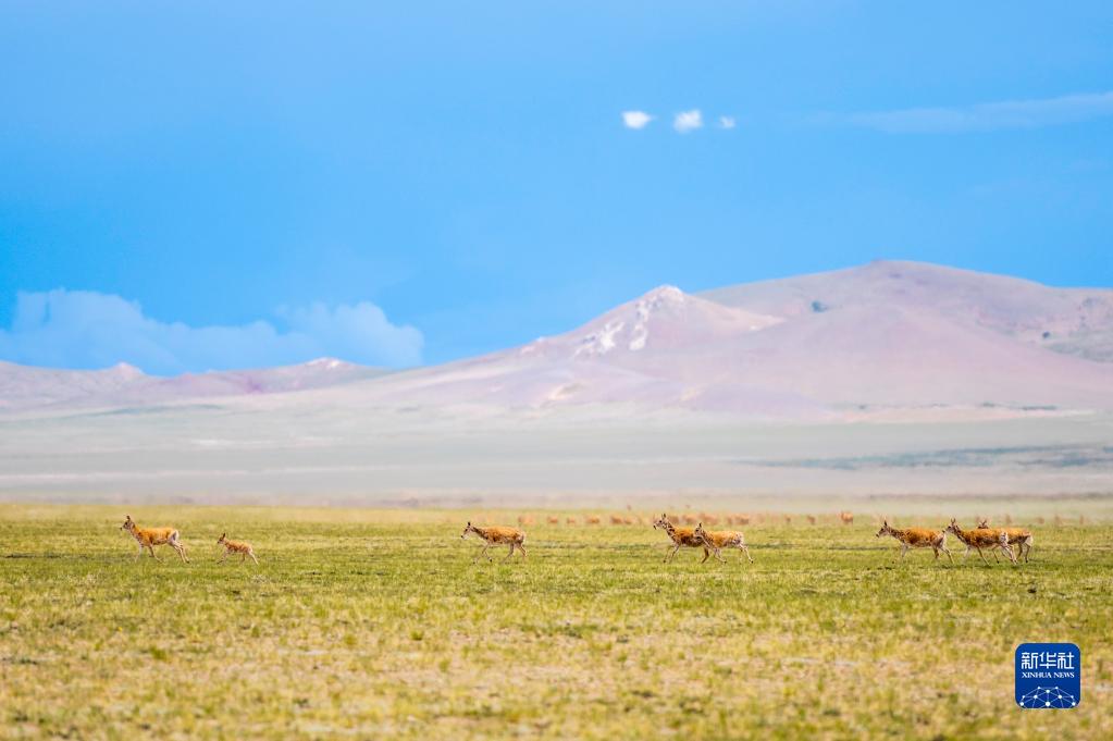 在西藏自治區(qū)北部的羌塘國家級自然保護(hù)區(qū),藏羚羊在草原上奔跑(2022年7月11日攝)。新華社記者 周荻瀟 攝