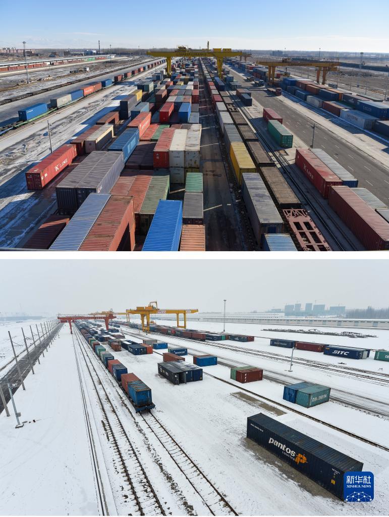 拼版照片:上圖為2021年2月6日拍攝的新疆霍爾果斯鐵路口岸換裝場(chǎng)內(nèi)的換裝作業(yè)場(chǎng)景(新華社記者 丁磊 攝);下圖為2013年12月25日拍攝的新疆霍爾果斯火車站換裝場(chǎng)(新華社記者 江文耀 攝)。新華社發(fā)