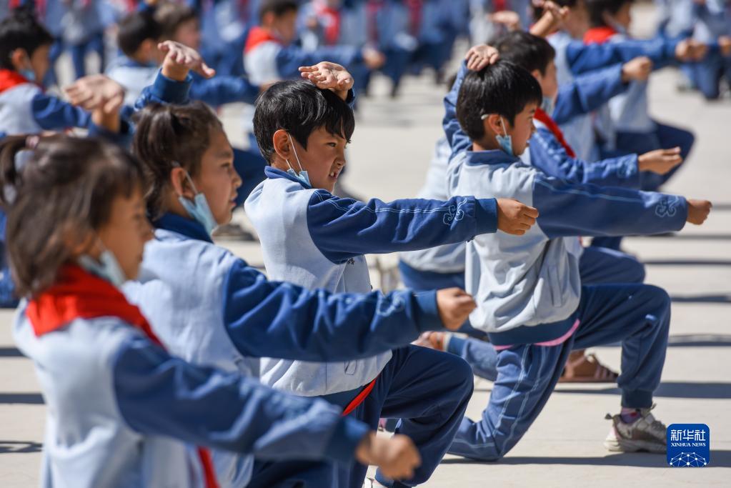 在新疆阿克蘇地區(qū)烏什縣依麻木鎮(zhèn)國(guó)家通用語言小學(xué),學(xué)生們?cè)谧稣n間操(2022年6月8日攝)。新華社記者 丁磊 攝