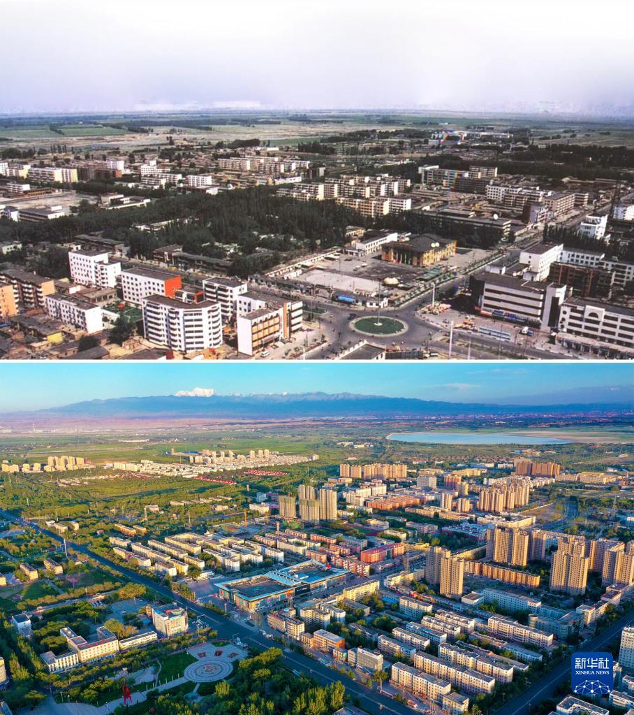 拼版照片:上圖為2000年拍攝的新疆生產(chǎn)建設(shè)兵團農(nóng)六師五家渠市(資料照片);下圖為2020年7月26日無人機拍攝的新疆生產(chǎn)建設(shè)兵團第六師五家渠市(李華北攝)。新華社發(fā)