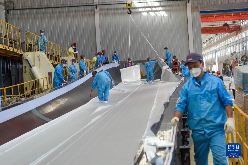 新疆生產(chǎn)建設(shè)兵團新星經(jīng)濟技術(shù)開發(fā)區(qū)一家風電葉片企業(yè)的員工在車間忙碌(2022年7月27日攝)。新華社記者 丁磊 攝