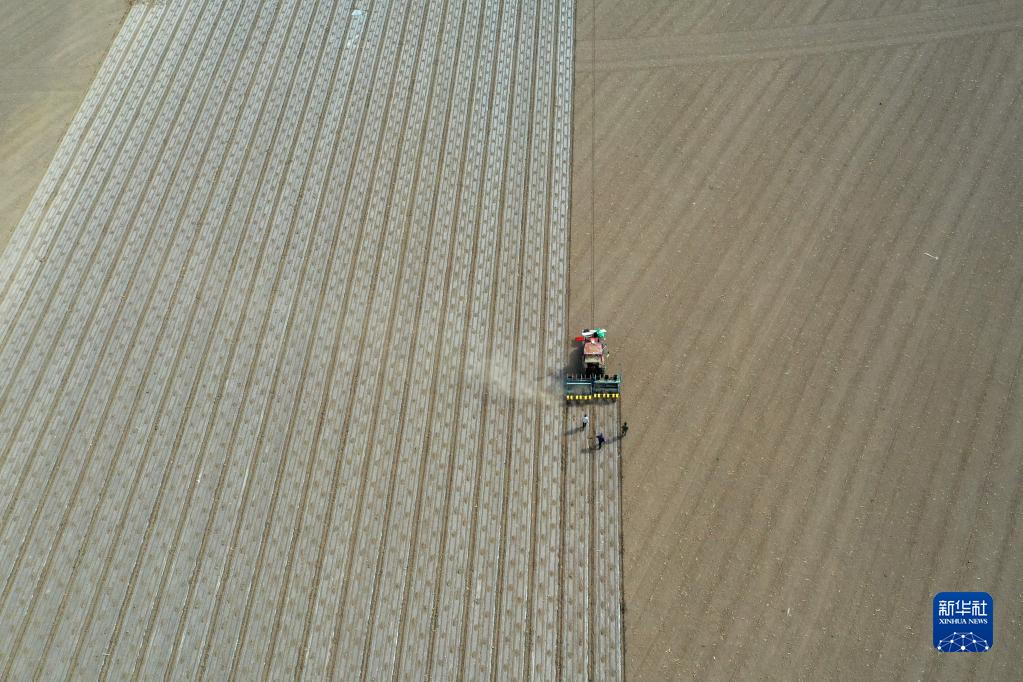 在新疆生產(chǎn)建設(shè)兵團第六師共青團農(nóng)場的棉田里,職工操作搭載北斗導航系統(tǒng)的播種機進行春播(2022年4月19日攝,無人機照片)。新華社記者 丁磊 攝