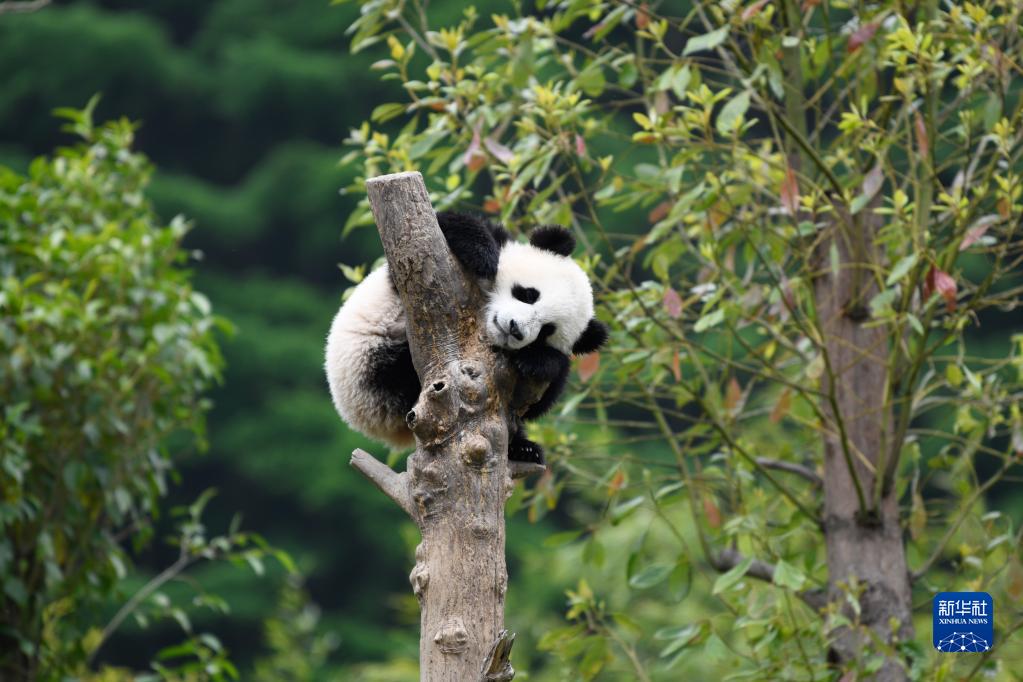 在中國(guó)大熊貓保護(hù)研究中心臥龍神樹(shù)坪基地內(nèi),一只大熊貓?jiān)跇?shù)上休息(2022年4月24日攝)。 新華社記者 胥冰潔 攝