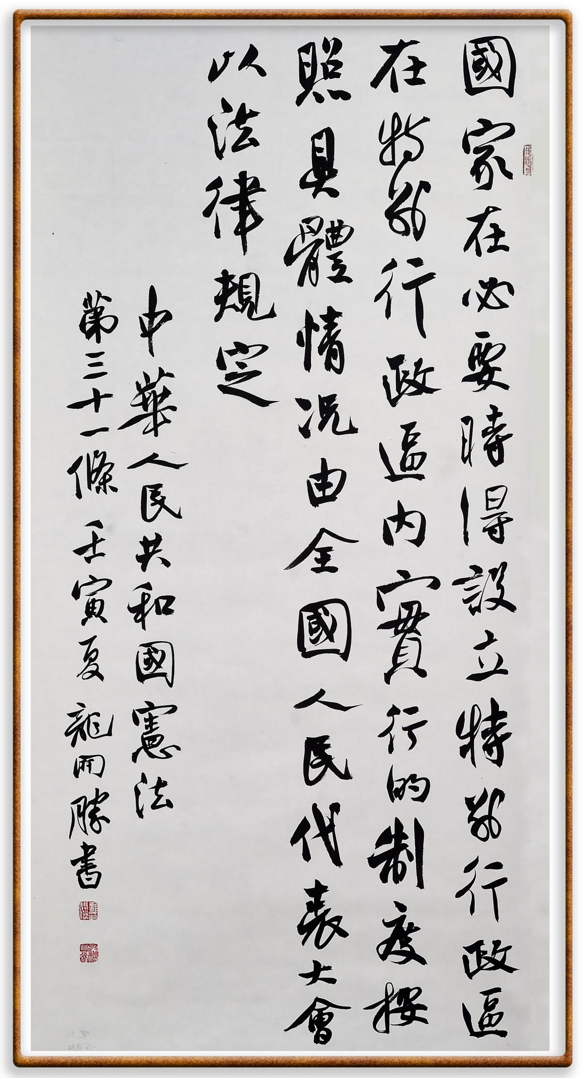 繼《中華人民共和國民法典》《中華人民共和國土地管理法》《中華人民共和國土地管理法實施條例》《中華人民共和國法律援助法》之后,法治日報社聯(lián)合北京市司法局、北京書法家協(xié)會,將筆端對準《中華人民共和國憲法》和《中華人民共和國行政處罰法》。